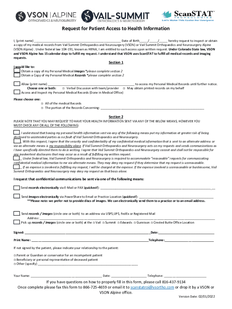 Request for Patient Access to Health Information I, (print name) ___ Date of Birth___/___/___ hereby request to inspect or obtain a copy of my medical records from View Summit Orthopedics and Neurosurgery