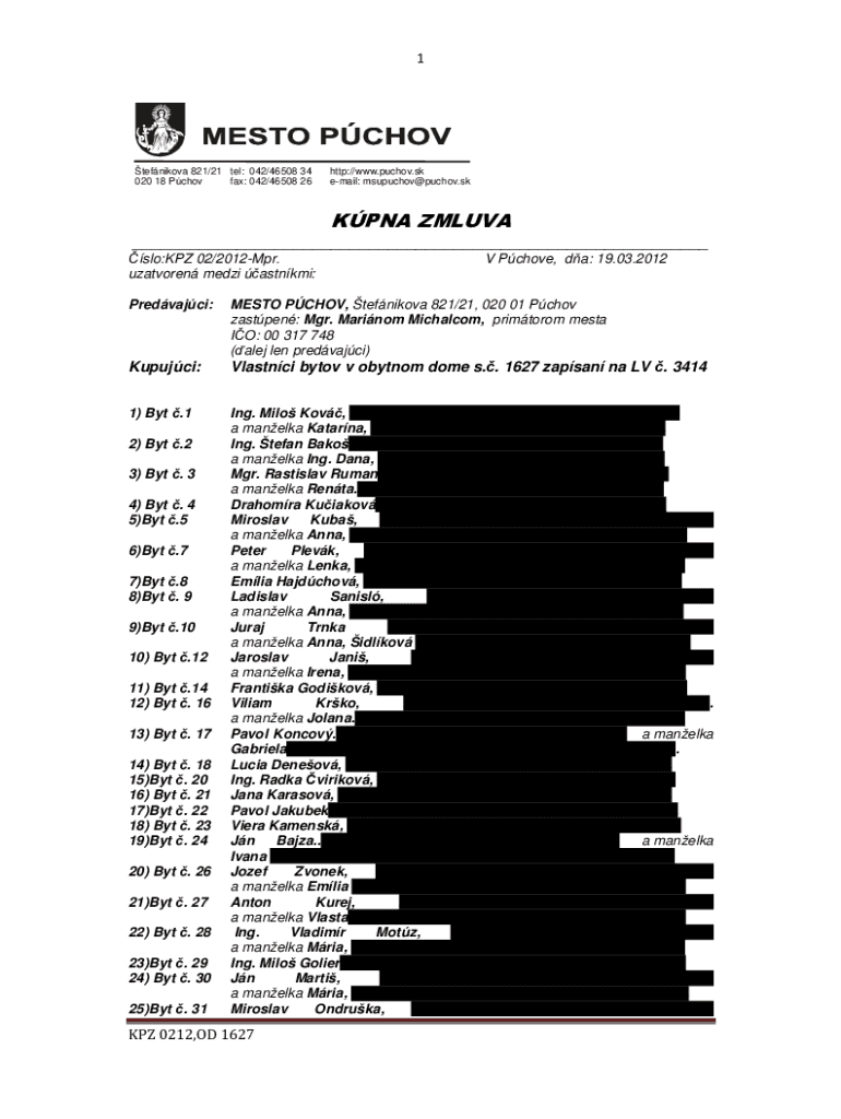 1tefnikova 821/21 tel: 042/46508 34 020 18 Pchov fax: 042/46508 26http://www.puchov.sk email: msupuchov@puchov.skKPNA ZMLUVA ___ slo:KPZ 02/2012Mpr. uzatvoren medzi astnkmi:V Pchove, da: 19.03.2012Predvajci:MESTO