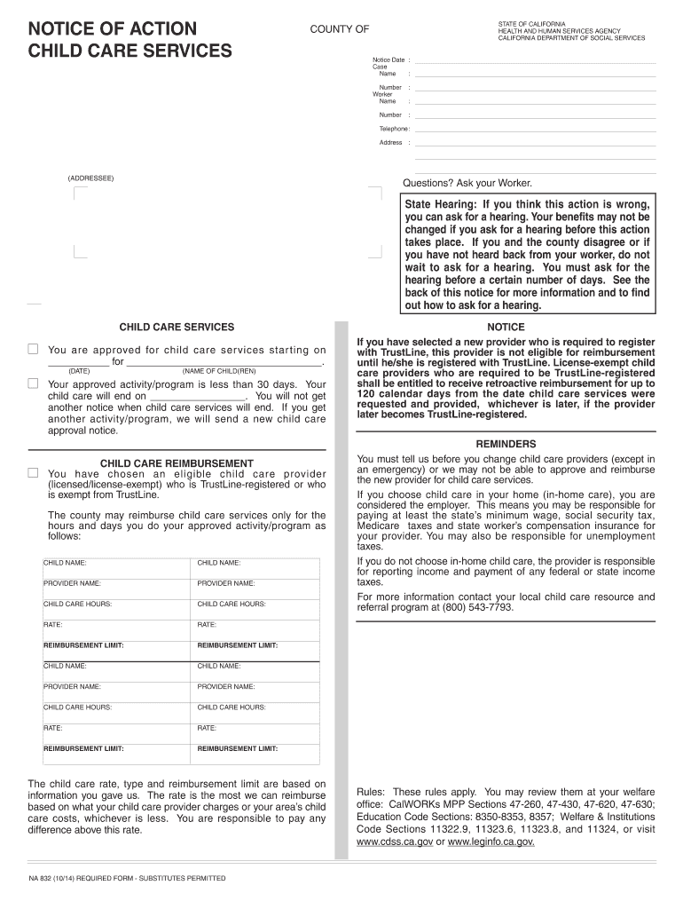 NOTICE OF ACTION CHILD CARE SERVICES STATE OF CALIFORNIA HEALTH AND HUMAN SERVICES AGENCY CALIFORNIA DEPARTMENT OF SOCIAL SERVICES COUNTY OF Notice Date : Case : Name Number Worker Name : Number :