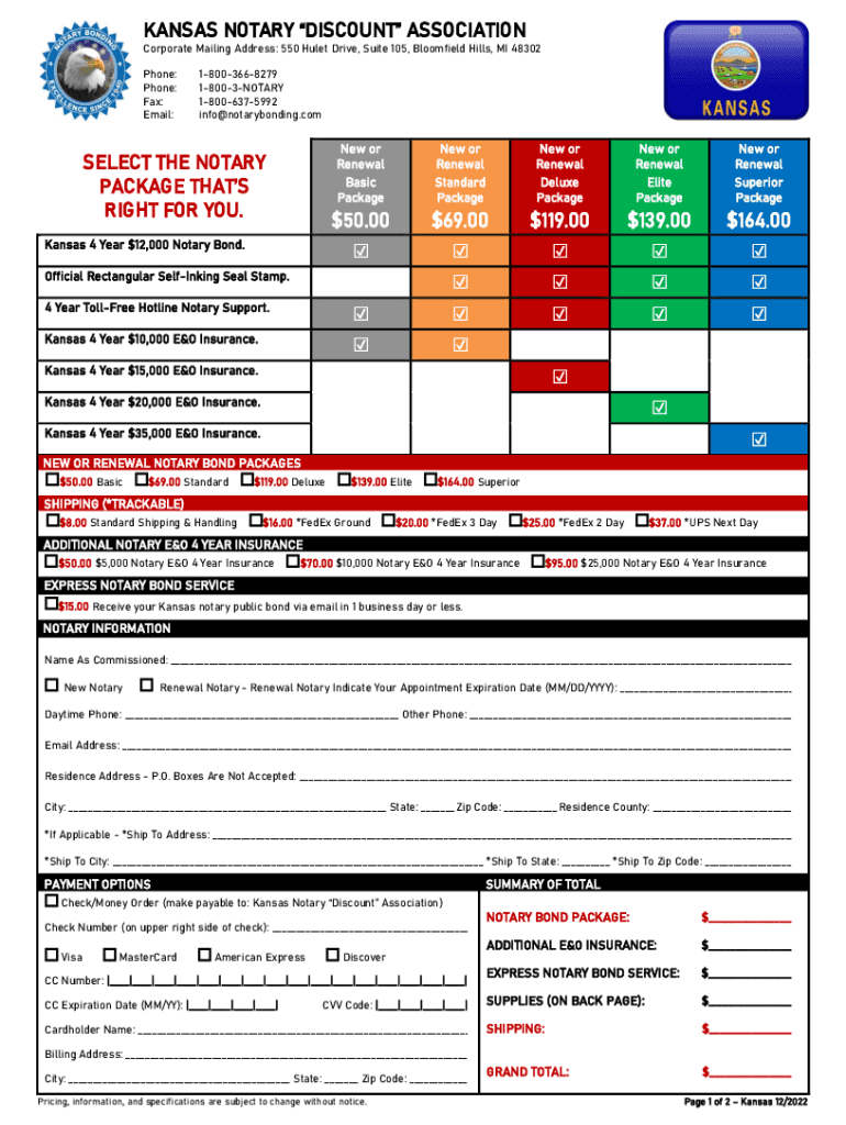 KANSAS NOTARY DISCOUNT ASSOCIATIONCorporate Mailing Address: 550 Hulet Drive, Suite 105, Bloomfield Hills, MI 48302 Phone: Phone: Fax: Email:18003668279 18003NOTARY 18006375992 info@notarybonding.comSELECT