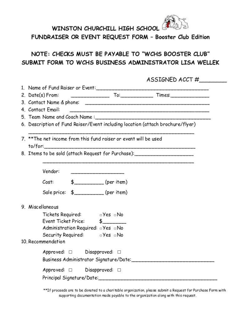 WINSTON CHURCHILL HIGH SCHOOL FUNDRAISER OR EVENT REQUEST FORM Booster Club Edition NOTE: CHECKS MUST BE PAYABLE TO WCHS BOOSTER CLUB SUBMIT FORM TO WCHS BUSINESS ADMINISTRATOR LISA WELLEK ASSIGNED