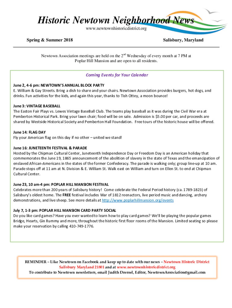 Historic Newtown Neighborhood News www.newtownhistoricdistrict.org Spring & Summer 2018Salisbury, MarylandNewtown Association meetings are held on the 2nd Wednesday of every month at 7 PM at Poplar