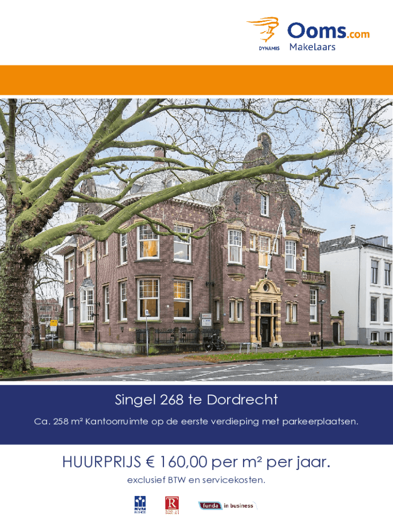 Singel 268 te Dordrecht Ca. 258 m Kantoorruimte op de eerste verdieping met parkeerplaatsen.HUURPRIJS 160,00 per m per jaar. exclusief BTW en servicekosten.KenmerkenHuurprijs Kantoorruimte: 160, per