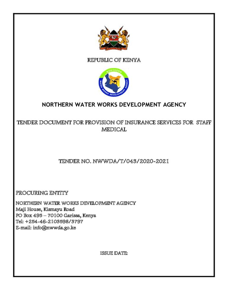 REPUBLIC OF KENYANORTHERN WATER WORKS DEVELOPMENT AGENCY TENDER DOCUMENT FOR PROVISION OF INSURANCE SERVICES FOR STAFF MEDICALTENDER NO. NWWDA/T/043/20202021PROCURING ENTITY NORTHERN WATER WORKS DEVELOPMENT
