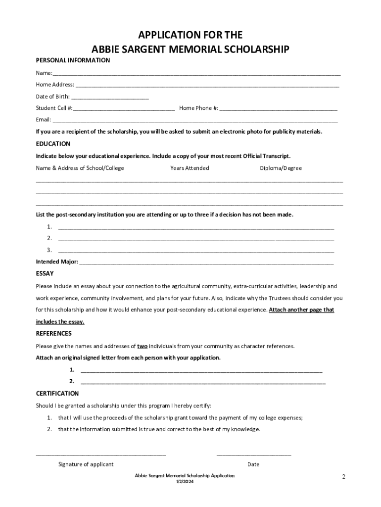 Abbie Sargent Memorial Scholarship, Inc. C/o NH Farm Bureau Federation 295 Sheep Davis Road, Concord, NH 03301 603.224.1934 The Abbie Sargent Memorial Scholarship is available to all New Hampshire