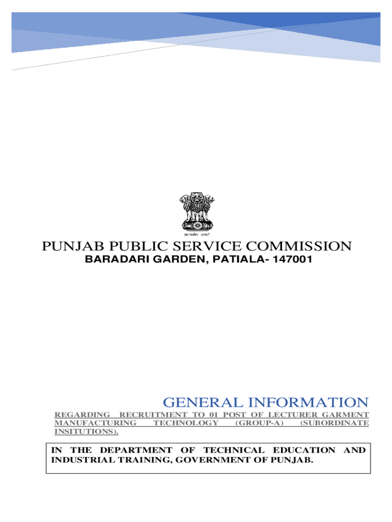 PUNJAB PUBLIC SERVICE COMMISSION BARADARI GARDEN, PATIALA 147001GENERAL INFORMATION REGARDING RECRUITMENT TO 01 POST OF LECTURER GARMENT MANUFACTURING TECHNOLOGY (GROUPA) (SUBORDINATE INSITUTIONS).IN