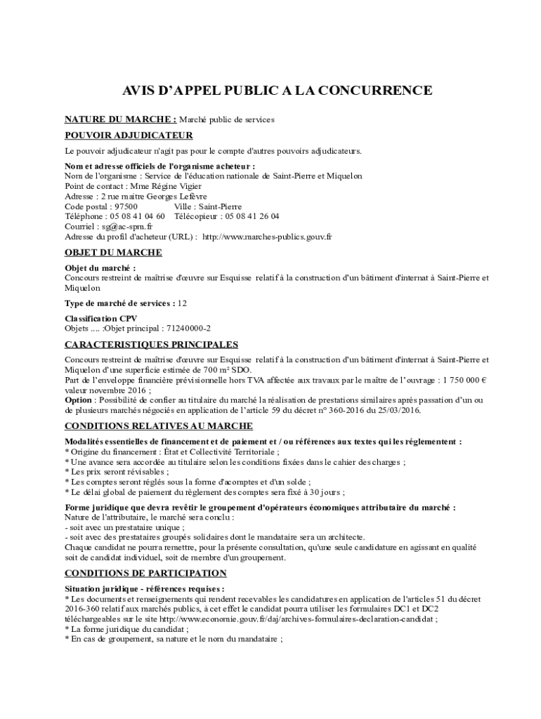 AVIS DAPPEL PUBLIC A LA CONCURRENCE NATURE DU MARCHE : March public de services POUVOIR ADJUDICATEUR Le pouvoir adjudicateur n\'agit pas pour le compte d\'autres pouvoirs adjudicateurs. Nom et adresse