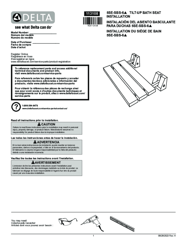 1131085SESBS6p TILTUP BATH SEAT INSTALLATION INSTALACIN DEL ASIENTO BASCULANTE PARA DUCHAS 5SESBS6p INSTALLATION DU SIGE DE BAIN 5SESBS6pModel Number: ___ Nmero del modelo Numro de modle Date of Purchase: