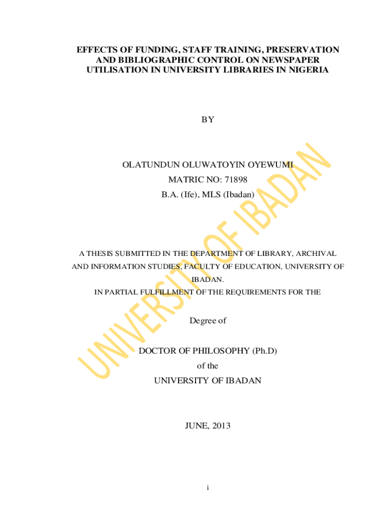 EFFECTS OF FUNDING, STAFF TRAINING, PRESERVATION AND BIBLIOGRAPHIC CONTROL ON NEWSPAPER UTILISATION IN UNIVERSITY LIBRARIES IN NIGERIABYOLATUNDUN OLUWATOYIN OYEWUMI MATRIC NO: 71898 B.A. (Ife), MLS