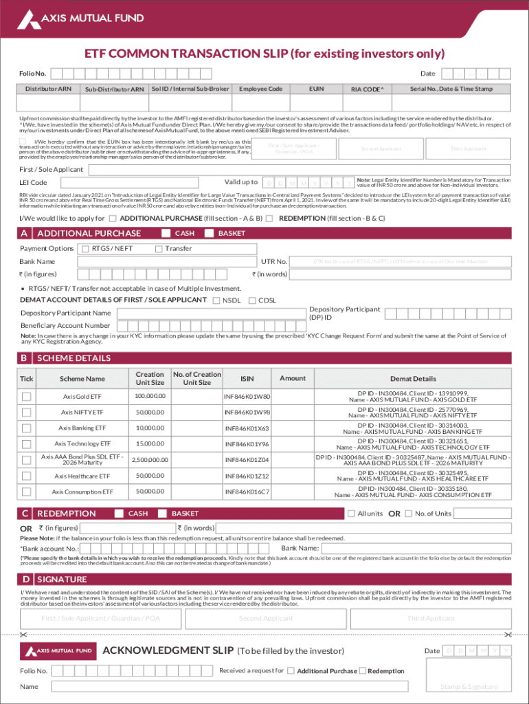 ETF COMMON TRANSACTION SLIP (for existing investors only) DateFolio No. Distributor ARNSubDistributor ARNSol ID / Internal SubBrokerEmployee CodeEUINDDMMYYSerial No., Date & Time StampRIA CODE^Upfront