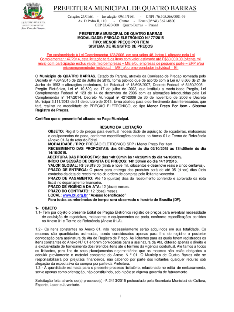 PREFEITURA MUNICIPAL DE QUATRO BARRAS Criao: 25/01/61 Instalao: 09/11/1961 CNPJ: 76.105.568/000139 Av. D.Pedro II, 110 Centro Fone: (0**41) 36718800 CEP 83.420000 Quatro Barras Paran PREFEITURA MUNICIPAL