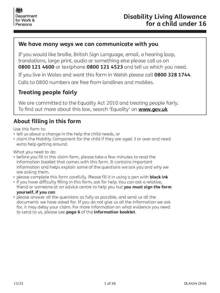 Disability Living Allowance for a child under 16 We have many ways we can communicate with you If you would like braille, British Sign Language, email, a hearing loop, translations, large print, audio
