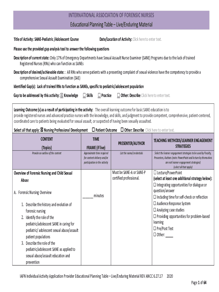 Title of Activity: SANEPediatric /Adolescent CourseD ate/Location of Activity: Click here to enter text.