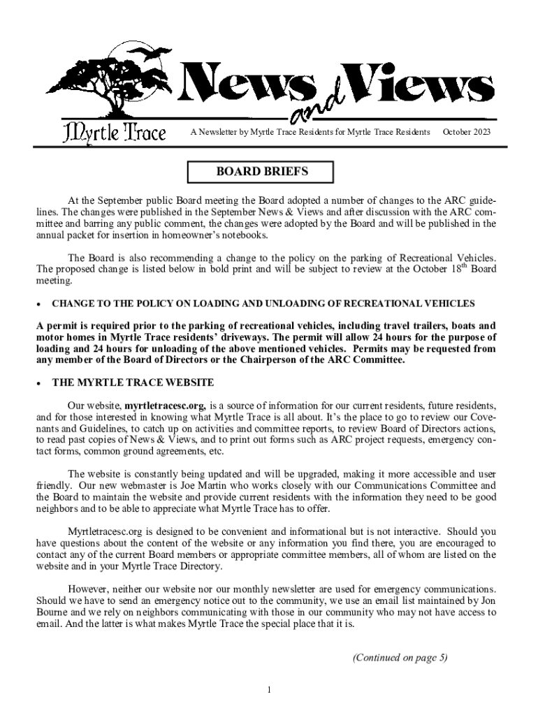 A Newsletter by Myrtle Trace Residents for Myrtle Trace ResidentsOctober 2023BOARD BRIEFS At the September public Board meeting the Board adopted a number of changes to the ARC guidelines. The changes
