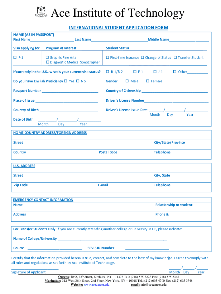 Ace Institute of Technology INTERNATIONAL STUDENT APPLICATION FORM NAME (AS IN PASSPORT) First Name___ Last Name___Middle Name___ Visa applying forProgram of InterestStudent Status F1 Graphic Fine