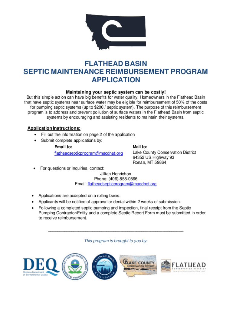 FLATHEAD BASIN SEPTIC MAINTENANCE REIMBURSEMENT PROGRAM APPLICATION Maintaining your septic system can be costly! But this simple action can have big benefits for water quality. Homeowners in the