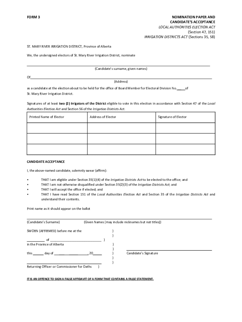 FORM 3NOMINATION PAPER AND CANDIDATES ACCEPTANCE LOCAL AUTHORITIES ELECTION ACT (Section 47, 151) IRRIGATION DISTRICTS ACT (Sections 35, 58)ST. MARY RIVER IRRIGATION DISTRICT, Province of Alberta