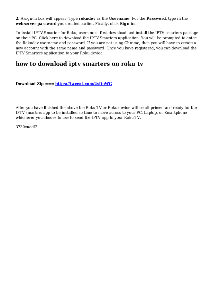 2. A signin box will appear. Type rokudev as the Username. For the Password, type in the webserver password you created earlier. Finally, click Sign in. To install IPTV Smarter for Roku, users must