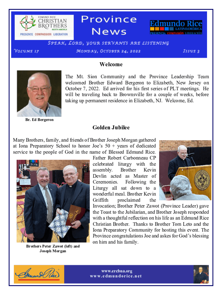 SPEAK, LORD, VOLUME 17YOUR SERVANTS ARE LISTENINGMONDAY, OCTOBER 24, 2022ISSUE 3Welcome The Mt. Sion Community and the Province Leadership Team welcomed Brother Edward Bergeron to Elizabeth, New Jersey