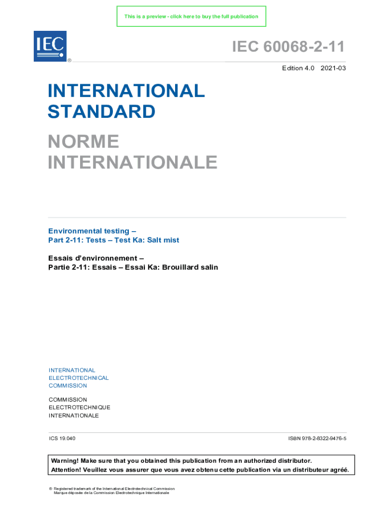 This is a preview click here to buy the full publicationIEC 60068211 Edition 4.0 202103INTERNATIONAL STANDARD NORME INTERNATIONALEEnvironmental testing Part 211: Tests Test Ka: Salt mist Essais denvironnement