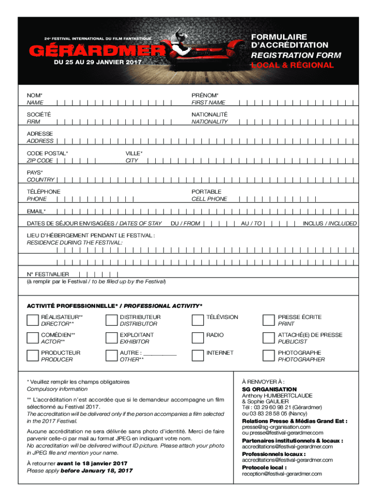 FORMULAIRE DACCRDITATION REGISTRATION FORM LOCAL & RGIONAL|||PRNOM* FIRST NAME||||||||||||||||SOCITFIRM| | | | | | | | | | | | | |||NATIONALIT NATIONALITY||||||||||||||||ADRESSEADDRESS|NOM*NAME| |