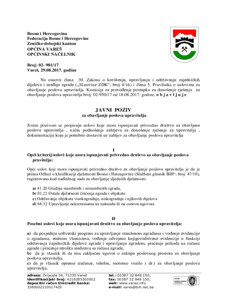 Bosna i Hercegovina Federacija Bosne i Hercegovine Zenikodobojski kanton OPINA VARE OPINSKI NAELNIK Broj: 02 981/17 Vare, 29.08.2017. godine Na osnovu lana 30. Zakona o koritenju, upravljanju i odravanju