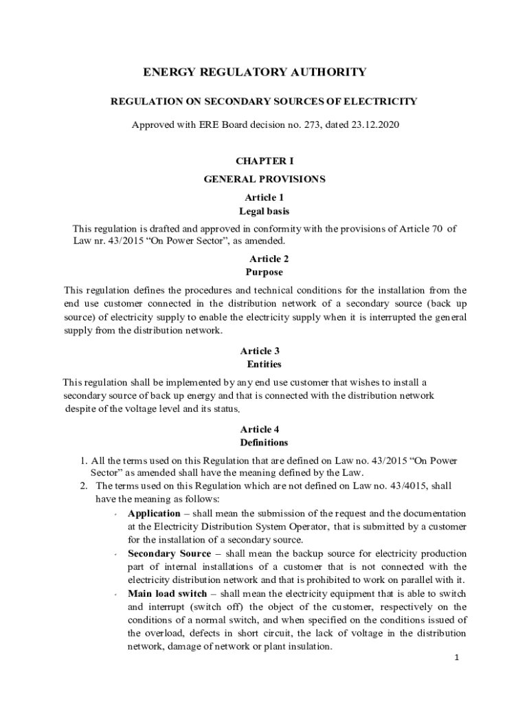 ENERGY REGULATORY AUTHORITY REGULATION ON SECONDARY SOURCES OF ELECTRICITY Approved with ERE Board decision no. 273, dated 23.12.2020 CHAPTER I GENERAL PROVISIONS Article 1 Legal basis This regulation
