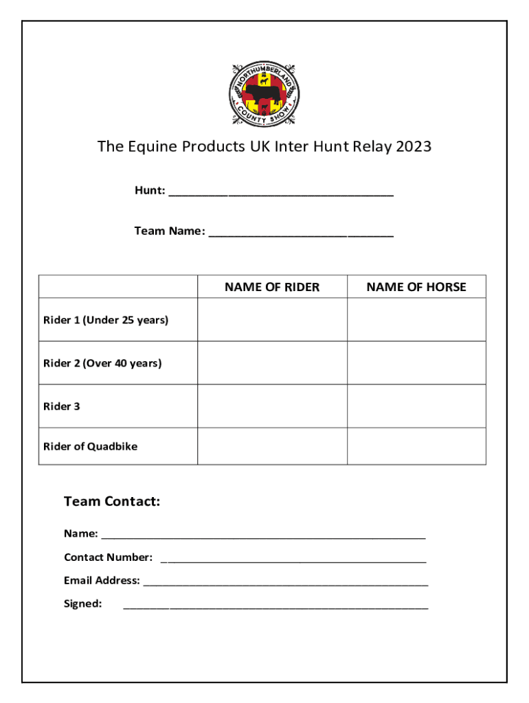 The Equine Products UK Inter Hunt Relay 2023 Hunt: ___ Team Name: ___NAME OF RIDERNAME OF HORSERider 1 (Under 25 years)Rider 2 (Over 40 years)Rider 3 Rider of QuadbikeTeam Contact: Name: ___ Contact
