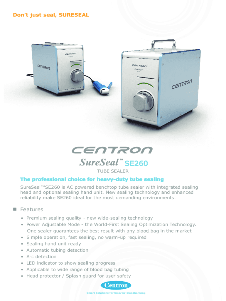 Dont just seal, SURESEALSE260TUBE SEALERThe professional choice for heavyduty tube sealing SureSealSE260 is AC powered benchtop tube sealer with integrated sealing head and optional sealing hand unit.