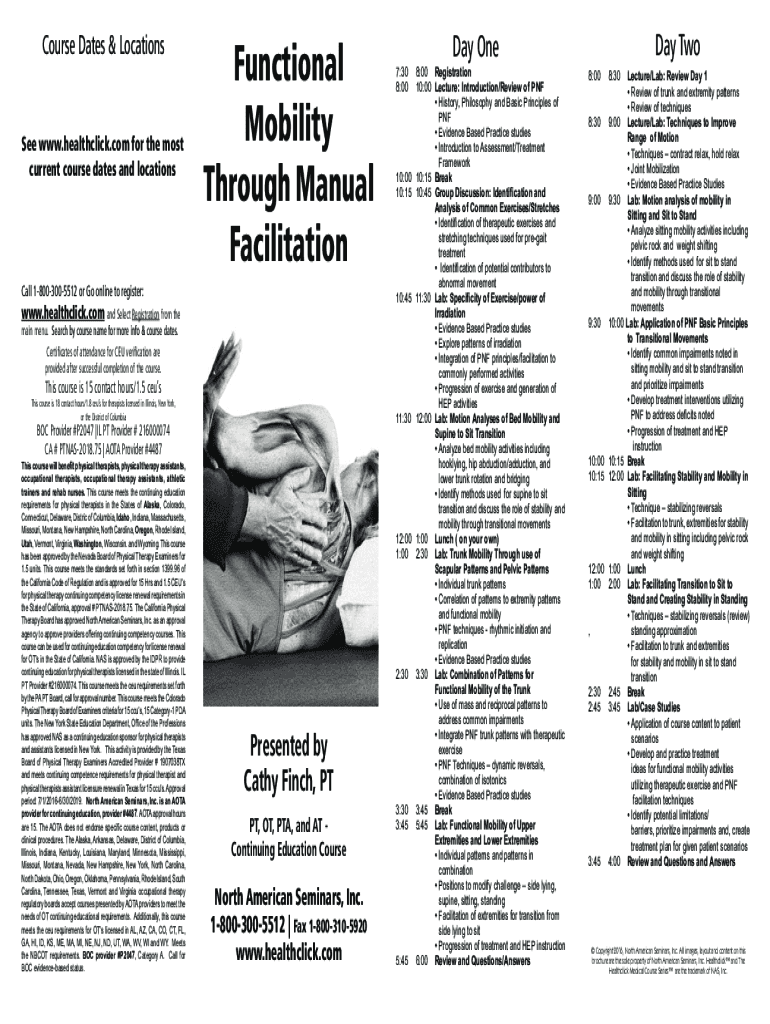 Course Dates & LocationsSee www.healthclick.com for the most current course dates and locationsFunctional Mobility Through Manual FacilitationCall 18003005512 or Go online to register:www.healthclick.com