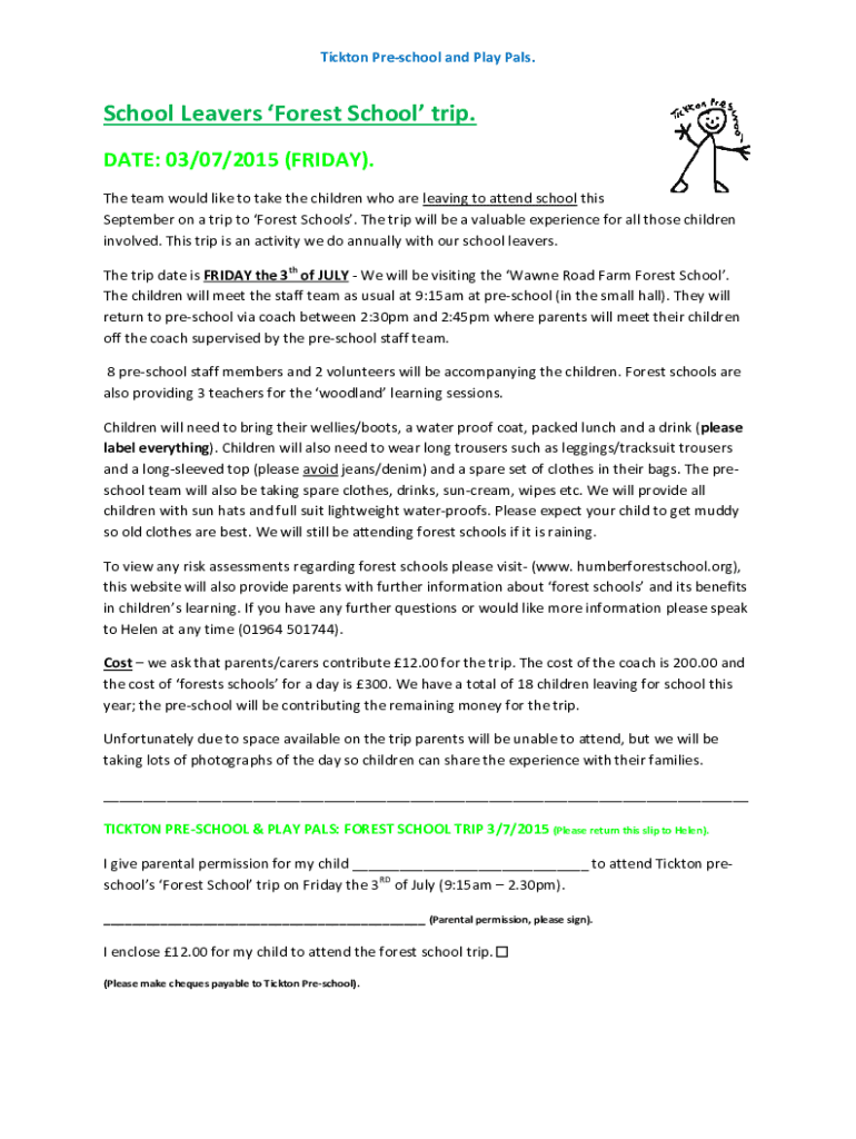 Tickton Preschool and Play Pals.School Leavers Forest School trip. DATE: 03/07/2015 (FRIDAY). The team would like to take the children who are leaving to attend school this September on a trip to