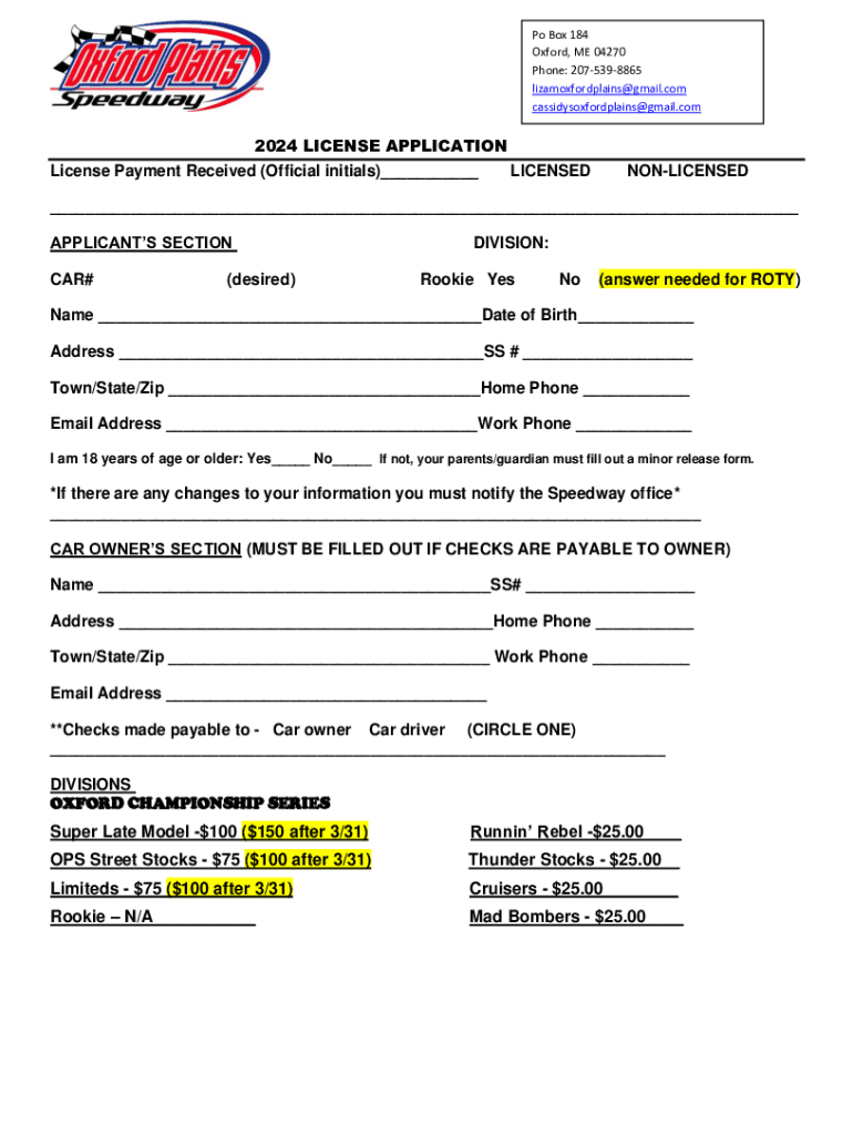 Po Box 184 Oxford, ME 04270 Phone: 2075398865 lizamoxfordplains@gmail.com cassidysoxfordplains@gmail.com2024 LICENSE APPLICATION License Payment Received (Official initials)___ LICENSEDNONLICENSED___