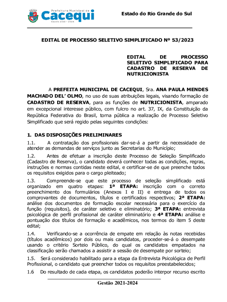 Estado do Rio Grande do SulEDITAL DE PROCESSO SELETIVO SIMPLIFICADO N 53/2023 EDITAL DE PROCESSO SELETIVO SIMPLIFICADO PARA CADASTRO DE RESERVA DE NUTRICIONISTA A PREFEITA MUNICIPAL DE CACEQUI, Sra.