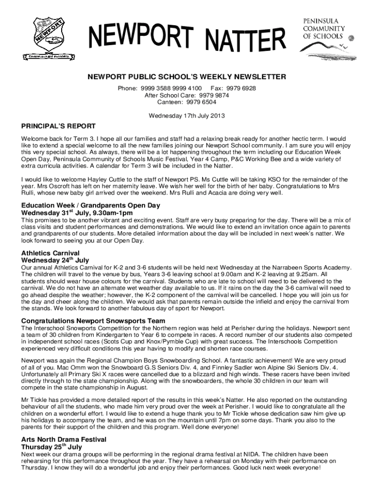 NEWPORT PUBLIC SCHOOLS WEEKLY NEWSLETTER Phone: 9999 3588 9999 4100 Fax: 9979 6928 After School Care: 9979 9874 Canteen: 9979 6504 Wednesday 17th July 2013PRINCIPALS REPORT Welcome back for Term 3.