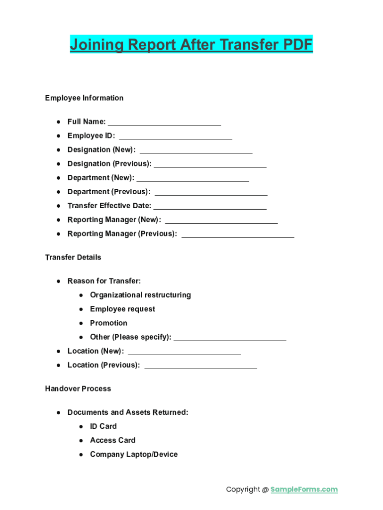 Joining Report After Transfer PDFEmployee Information Full Name: ___ Employee ID: ___ Designation (New): ___ Designation (Previous): ___ Department (New): ___ Department (Previous): ___ Transfer Effective