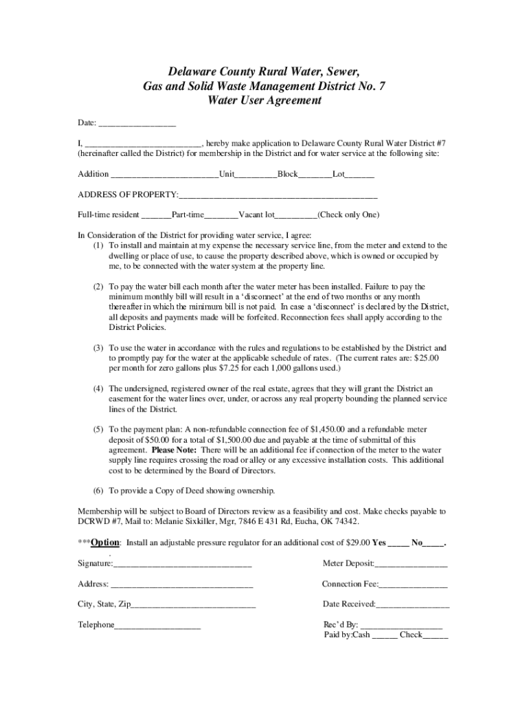 Delaware County Rural Water, Sewer, Gas and Solid Waste Management District No. 7 Water User Agreement Date: ___ I, ___, hereby make application to Delaware County Rural Water District #7 (hereinafter