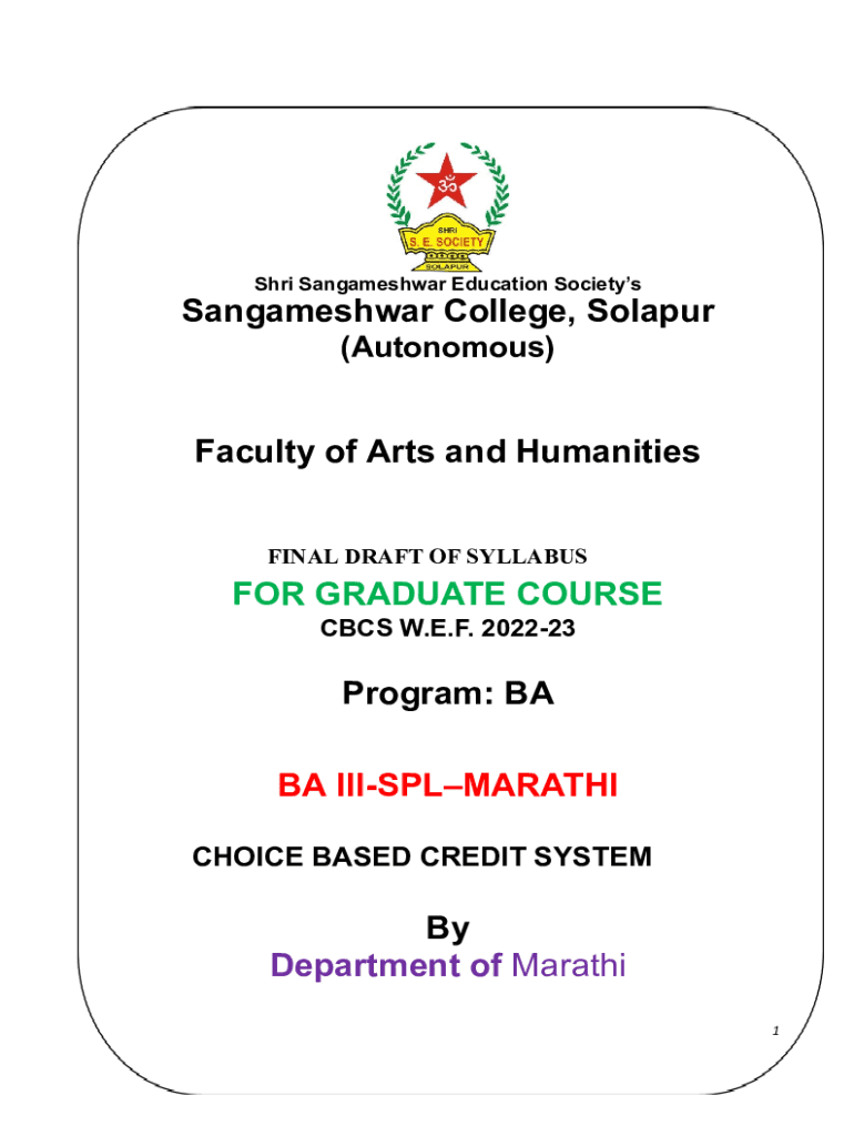 Shri Sangameshwar Education SocietysSangameshwar College, Solapur (Autonomous)Faculty of Arts and Humanities FINAL DRAFT OF SYLLABUSFOR GRADUATE COURSE CBCS W.E.F. 202223Program: BA BA IIISPLMARATHI
