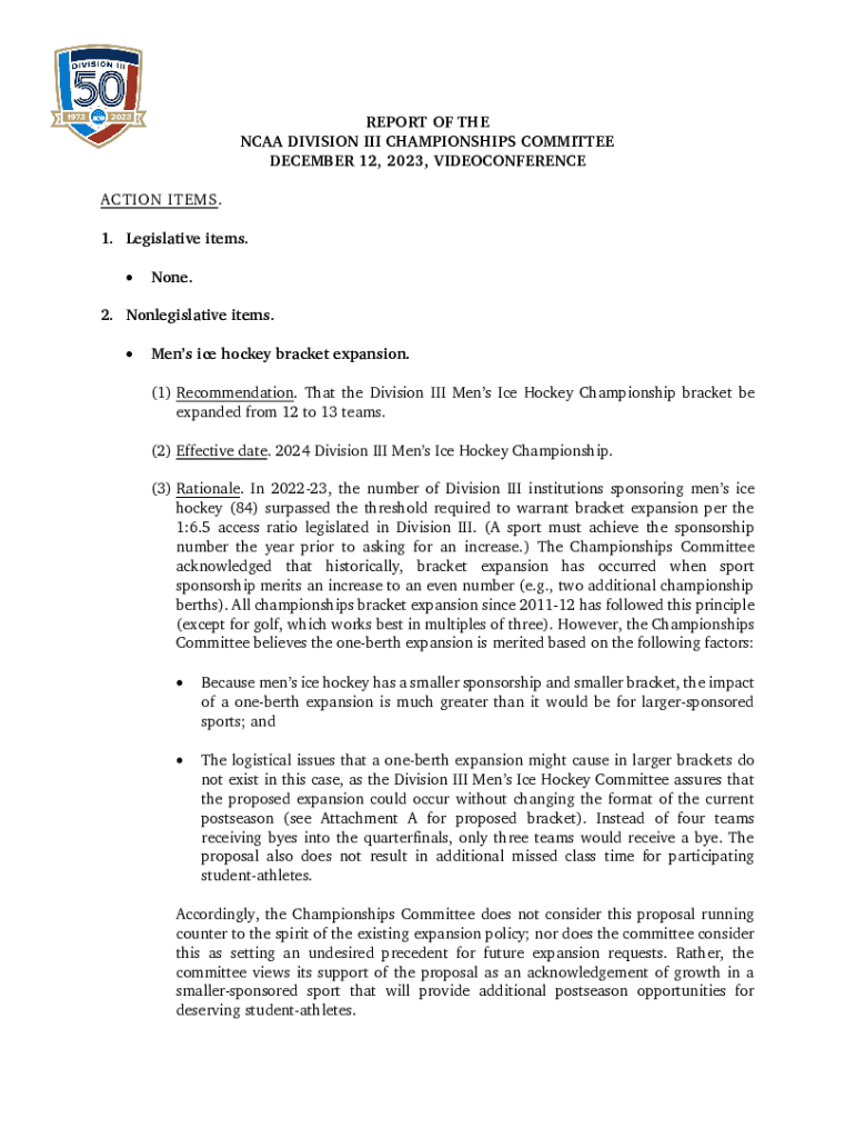 REPORT OF THE NCAA DIVISION III CHAMPIONSHIPS COMMITTEE DECEMBER 12, 2023, VIDEOCONFERENCE ACTION ITEMS. 1. Legislative items. None.2. Nonlegislative items. Mens ice hockey bracket expansion. (1)