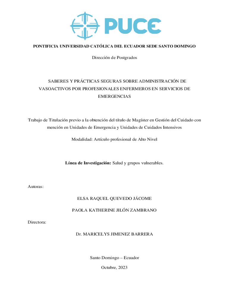 PONTIFICIA UNIVERSIDAD CATLICA DEL ECUADOR SEDE SANTO DOMINGODireccin de PostgradosSABERES Y PRCTICAS SEGURAS SOBRE ADMINISTRACIN DE VASOACTIVOS POR PROFESIONALES ENFERMEROS EN SERVICIOS DE EMERGENCIASTrabajo