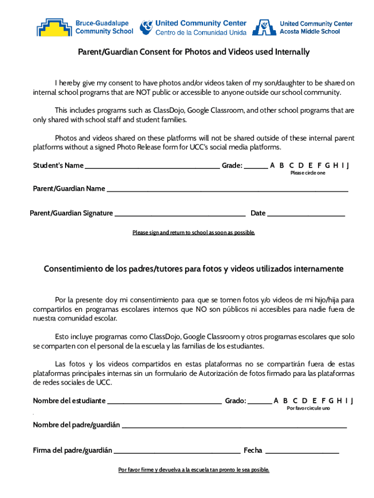 Parent/Guardian Consent for Photos and Videos used Internally I hereby give my consent to have photos and/or videos taken of my son/daughter to be shared on internal school programs that are NOT public