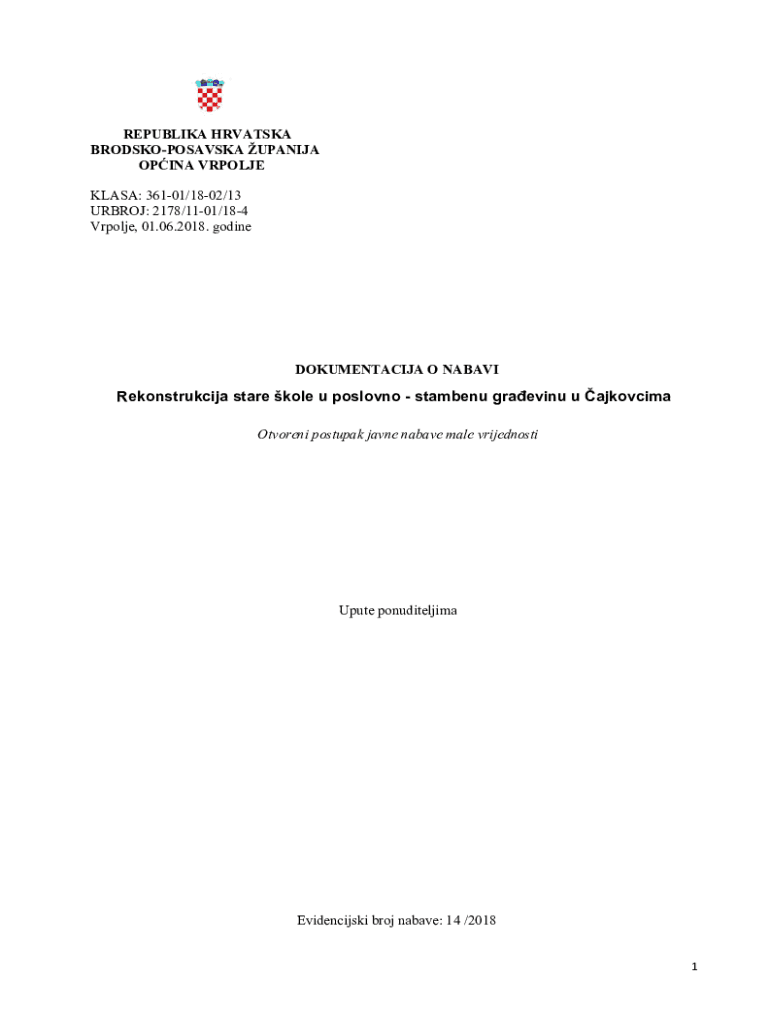 REPUBLIKA HRVATSKA BRODSKOPOSAVSKA UPANIJA OPINA VRPOLJE KLASA: 36101/1802/13 URBROJ: 2178/1101/184 Vrpolje, 01.06.2018. godineDOKUMENTACIJA O NABAVIRekonstrukcija stare kole u poslovno stambenu graevinu
