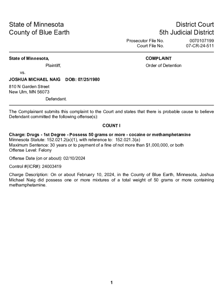 State of Minnesota County of Blue EarthDistrict Court 5th Judicial District Prosecutor File No. Court File No.State of Minnesota,0070107199 07CR24511COMPLAINTPlaintiff,Order of Detentionvs. JOSHUA