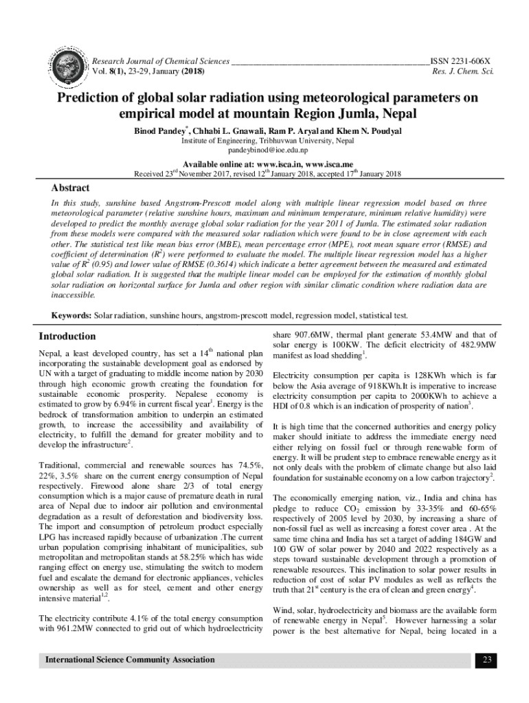 Research Journal of Chemical Sciences ___ ___ISSN 2231606X Vol. 8(1), 2329, January (20188) Res. J. Chem. Sci.Prediction of global solar radiation using meteorological parameters on empirical model