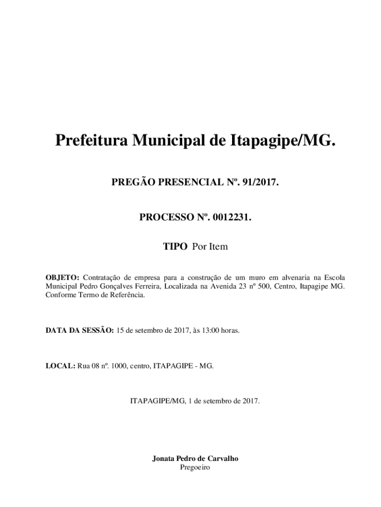 Prefeitura Municipal de Itapagipe/MG. PREGO PRESENCIAL N. 91/2017.PROCESSO N. 0012231. TIPO Por Item OBJETO: Contratao de empresa para a construo de um muro em alvenaria na Escola Municipal Pedro