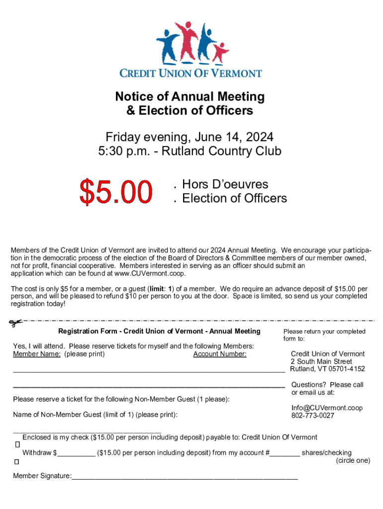 Notice of Annual Meeting & Election of Officers Friday evening, June 14, 2024 5:30 p.m. Rutland Country Club Hors Doeuvres Election of OfficersMembers of the Credit Union of Vermont are invited to