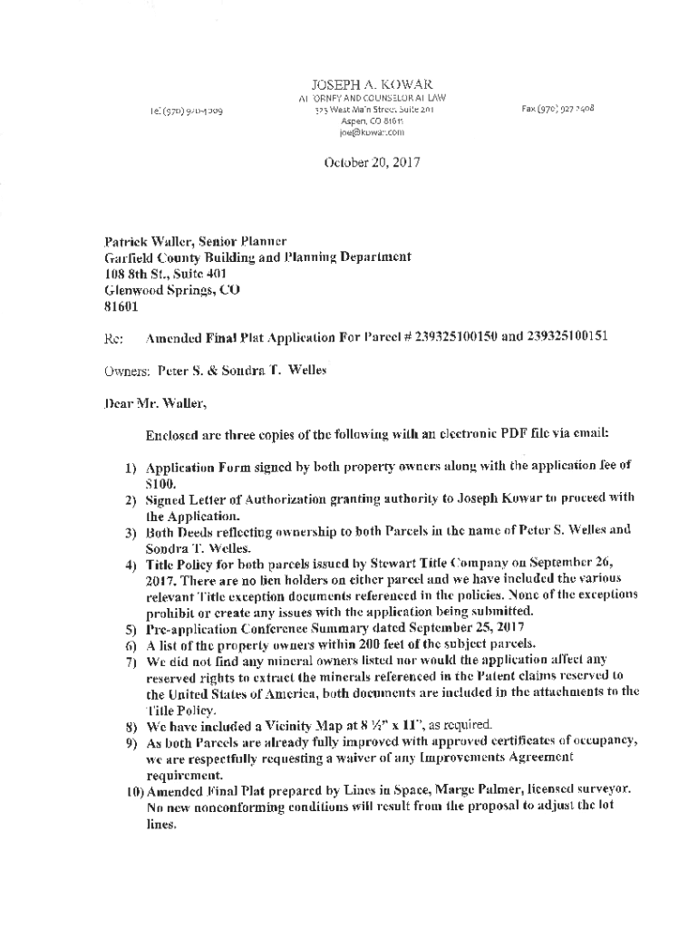 JOSEPH A. KOWAR ATTORNEY AND COUNSELOR AT LAW Ij23 West Main Street Sui[e zotel (97o) 92o4o09Aspen, COFax (97o) gz724o881611joe@kowar.comOctober 20,2017Patrick Waller, Senior Planner Garfield County