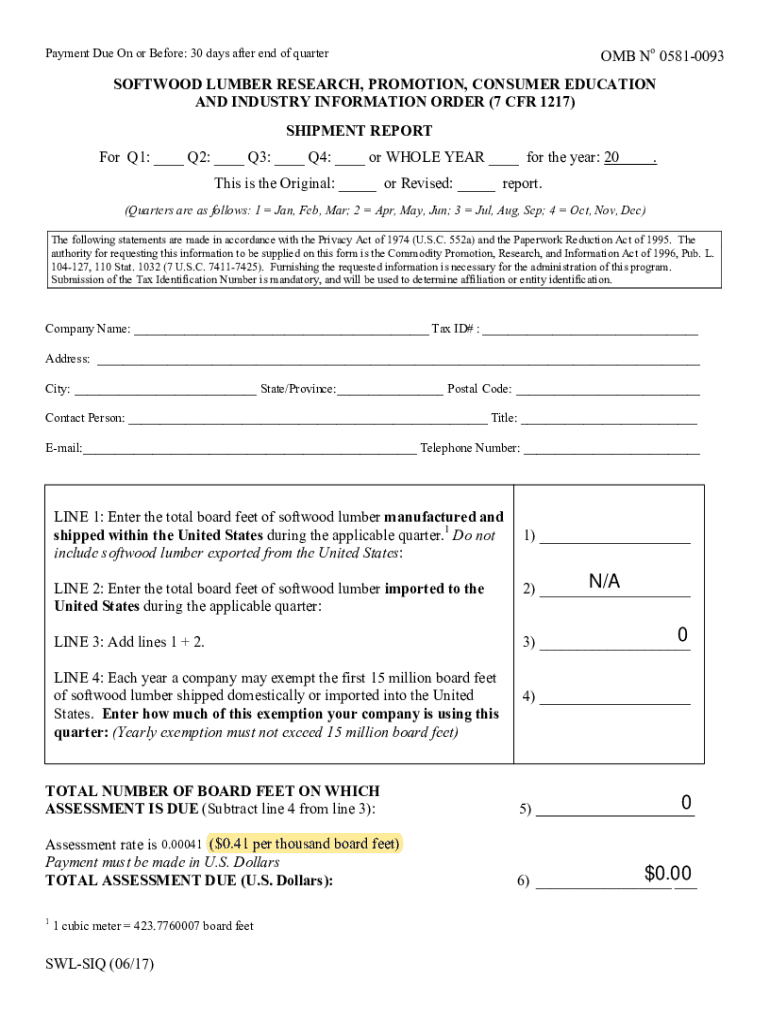 OMB No 05810093Payment Due On or Before: 30 days after end of quarterSOFTWOOD LUMBER RESEARCH, PROMOTION, CONSUMER EDUCATION AND INDUSTRY INFORMATION ORDER (7 CFR 1217) SHIPMENT REPORT For Q1: ___