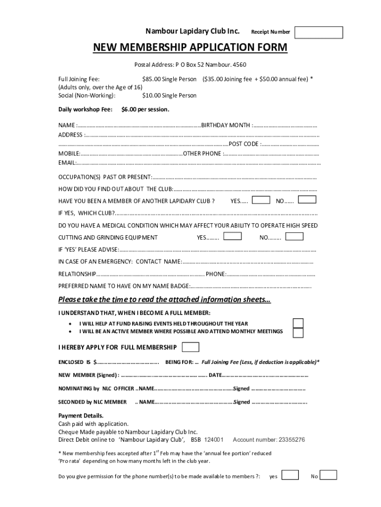 Nambour Lapidary Club Inc.Receipt NumberNEW MEMBERSHIP APPLICATION FORM Postal Address: P O Box 52 Nambour. 4560 Full Joining Fee: $85.00 Single Person ($35.00 Joining fee + $50.00 annual fee) * (Adults