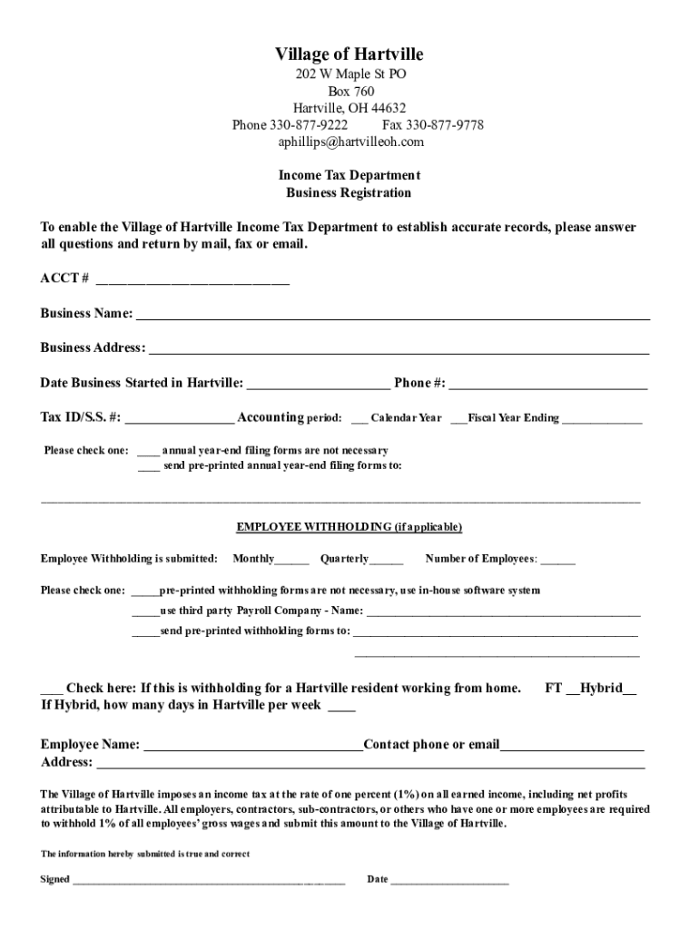 Village of Hartville 202 W Maple St PO Box 760 Hartville, OH 44632 Phone 3308779222 Fax 3308779778 aphillips@hartvilleoh.com Income Tax Department Business Registration To enable the Village of Hartville