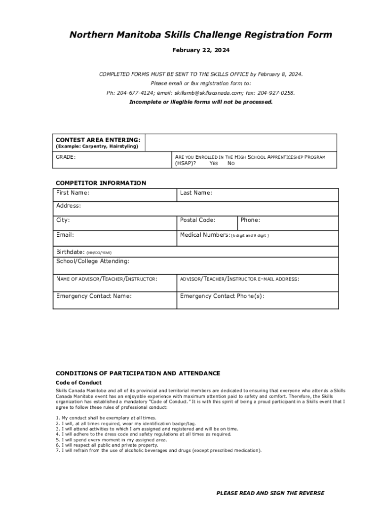 Northern Manitoba Skills Challenge Registration Form February 22, 2024COMPLETED FORMS MUST BE SENT TO THE SKILLS OFFICE by February 8, 2024. Please email or fax registration form to: Ph: 2046774124;